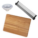 - Includes a wood cutting board, roll-up mat, and coordinating basket strainer drain