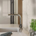 The Felis kitchen faucet has a straight pull-out spout for a timeless, minimalist look. Made with the highest quality components and exceptional German craftsmanship, it delivers precision performance every time. Standing at just 12.52 inches tall with a 360° swivel, the pull-out spout has an impressive range of motion, making it easy to fill and clean pots and pans, even in compact kitchens. Its space-saving design features a vertical handle that swings forward 90 degrees, eliminating the need for a full 180-degree rotation. The ceramic cartridge delivers smooth, quiet operation and the anti-lime aerator helps prevent the build-up of limescale. The flawless chrome finish has a reinforced coating that enhances durability and is easy to clean.