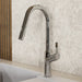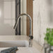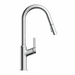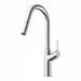 The Okab kitchen faucet has a pull-down spout with a classic curved design. Its architectural curve reaches forward for a modern, minimalist look. Made with the highest quality components and exceptional German craftsmanship, it delivers precision performance every time. Standing at just 15.94 inches tall with a 360° swivel, the pull-down spout has an impressive range of motion, making it easy to fill and clean pots and pans. The ceramic cartridge delivers smooth, quiet operation and the spray head features two spray modes: a powerful stream for thorough cleaning and a gentle spray specifically designed for more delicate tasks. The flawless chrome finish has a reinforced coating that enhances durability and is easy to clean.