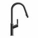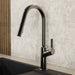 The Okab kitchen faucet has a pull-down spout with a classic curved design. Its architectural curve reaches forward for a modern, minimalist look. Made with the highest quality components and exceptional German craftsmanship, it delivers precision performance every time. Standing at just 15.94 inches tall with a 360° swivel, the pull-down spout has an impressive range of motion, making it easy to fill and clean pots and pans. The ceramic cartridge delivers smooth, quiet operation and the spray head features two spray modes: a powerful stream for thorough cleaning and a gentle spray specifically designed for more delicate tasks. The flawless matte graphite finish has a powder coating that is durable, virtually impervious to fingerprints, and easy to clean.