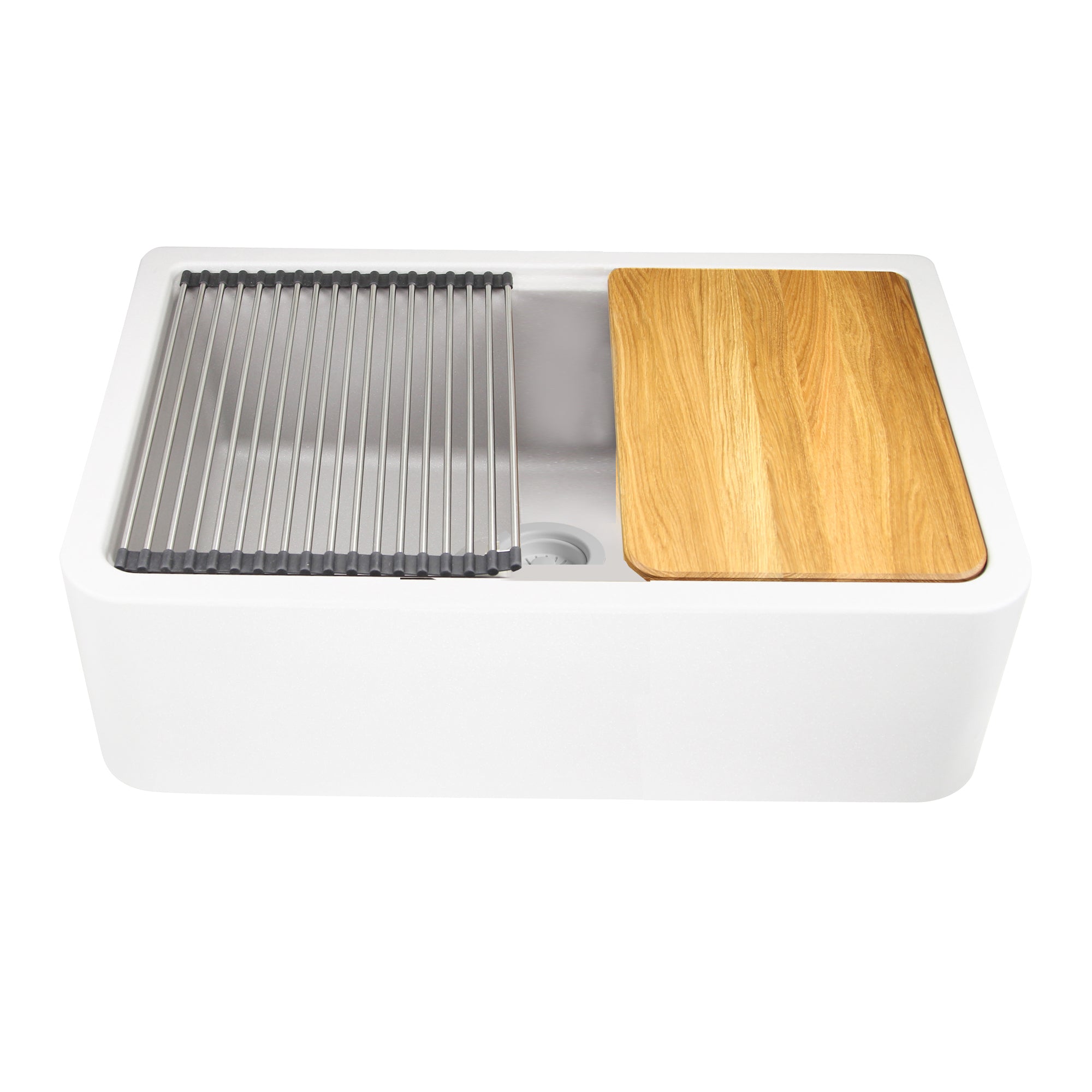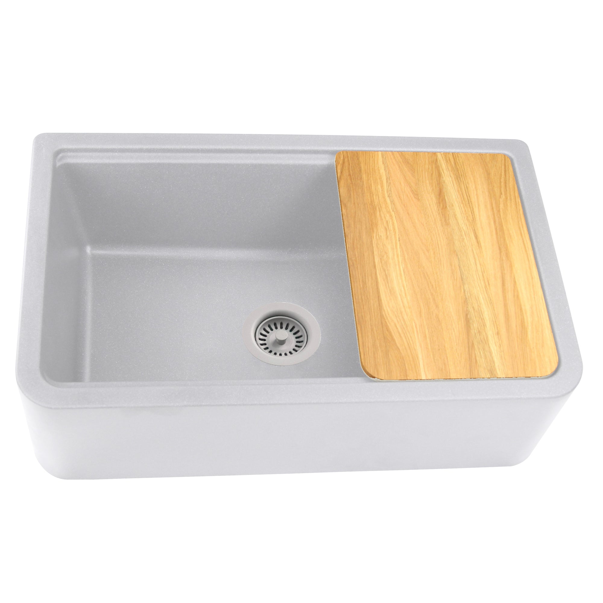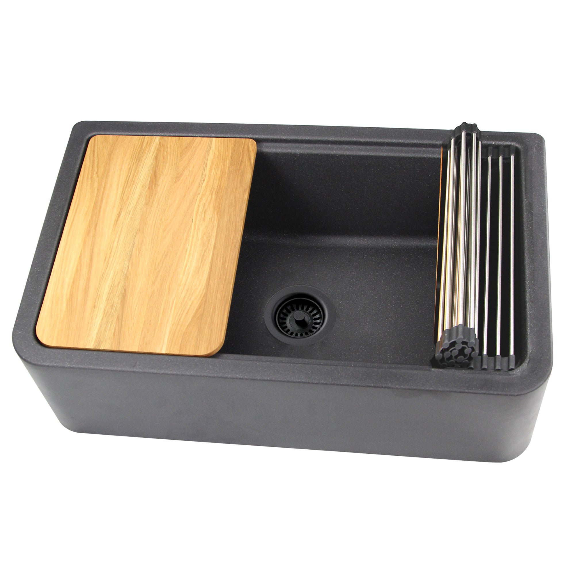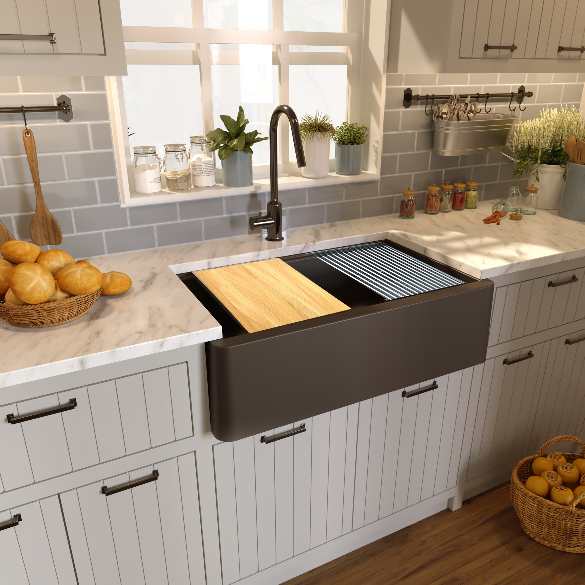 This sink is designed for maximum function. A true granite composite farmhouse workstation sink with a built-in ledge. Comes with an included stainless steel roll up mat and wood cutting board that fit right on the ledge so you can do your tasks over the sink! This 33-inch apron sink also comes with a color-coordinated decorative disposal flange trim and basket strainer drain.