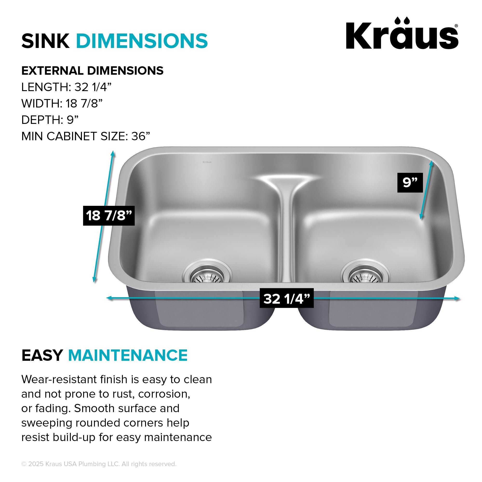 - EXTERNAL DIMS: 32 1/4” L x 18 7/8” W x 9” D – BOWL DIMS (Both Bowls): 14 1/2” L x 16 7/8” W x 8 5/8” D – Min. Cabinet Size: 36” – FAUCET HEIGHT: 18 3/4 in. – SPOUT HEIGHT: 6 1/4 in. – SPOUT REACH 8 5/8 in. – FLOW RATE 1.8 gpm