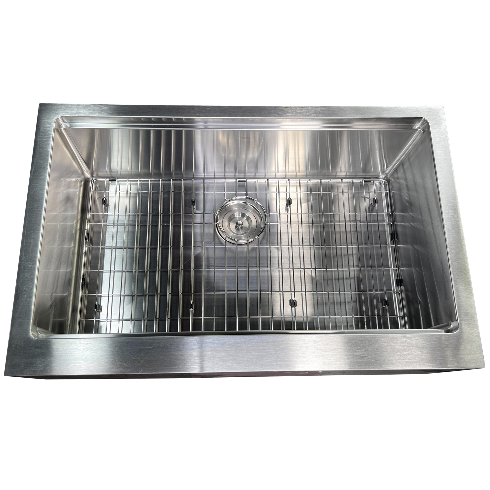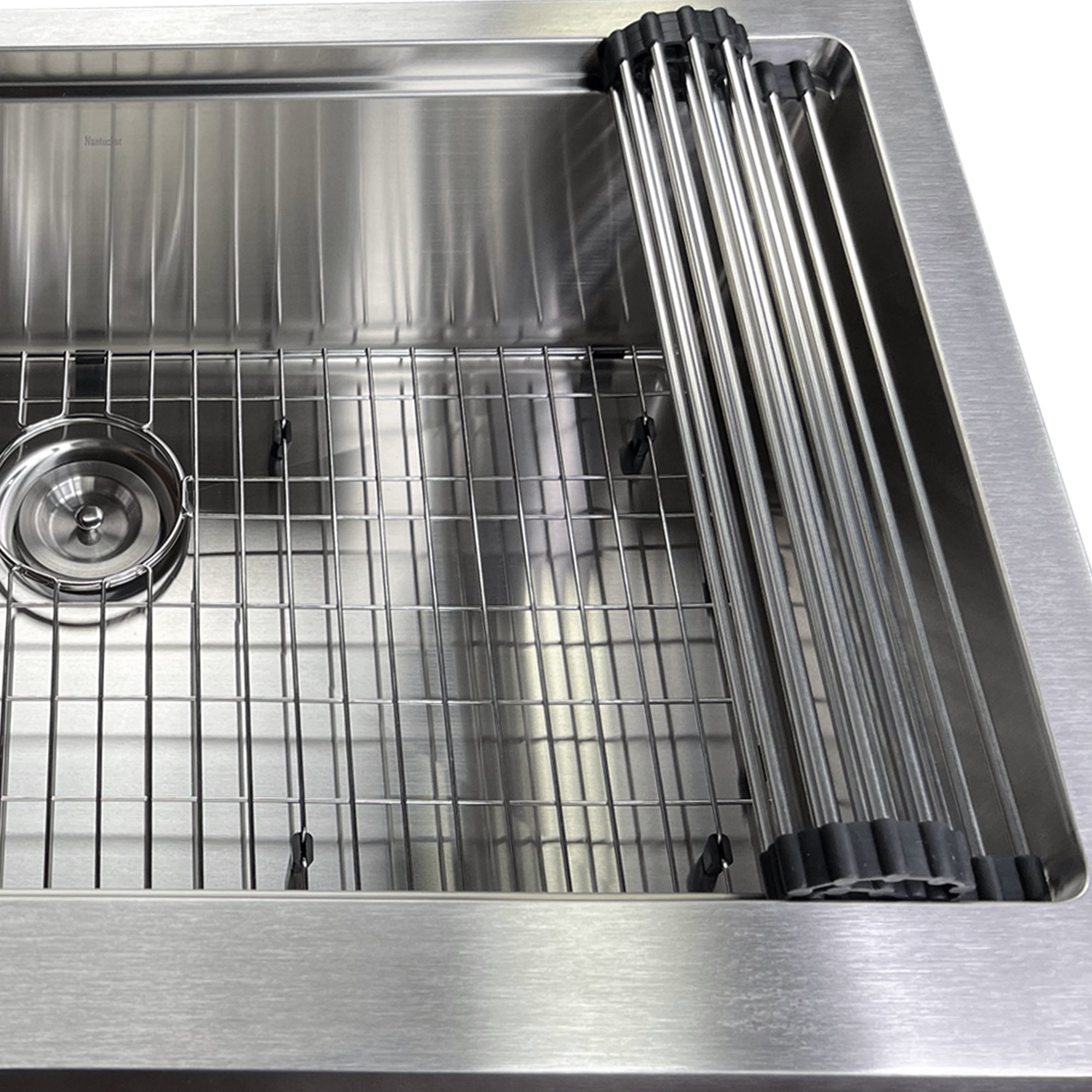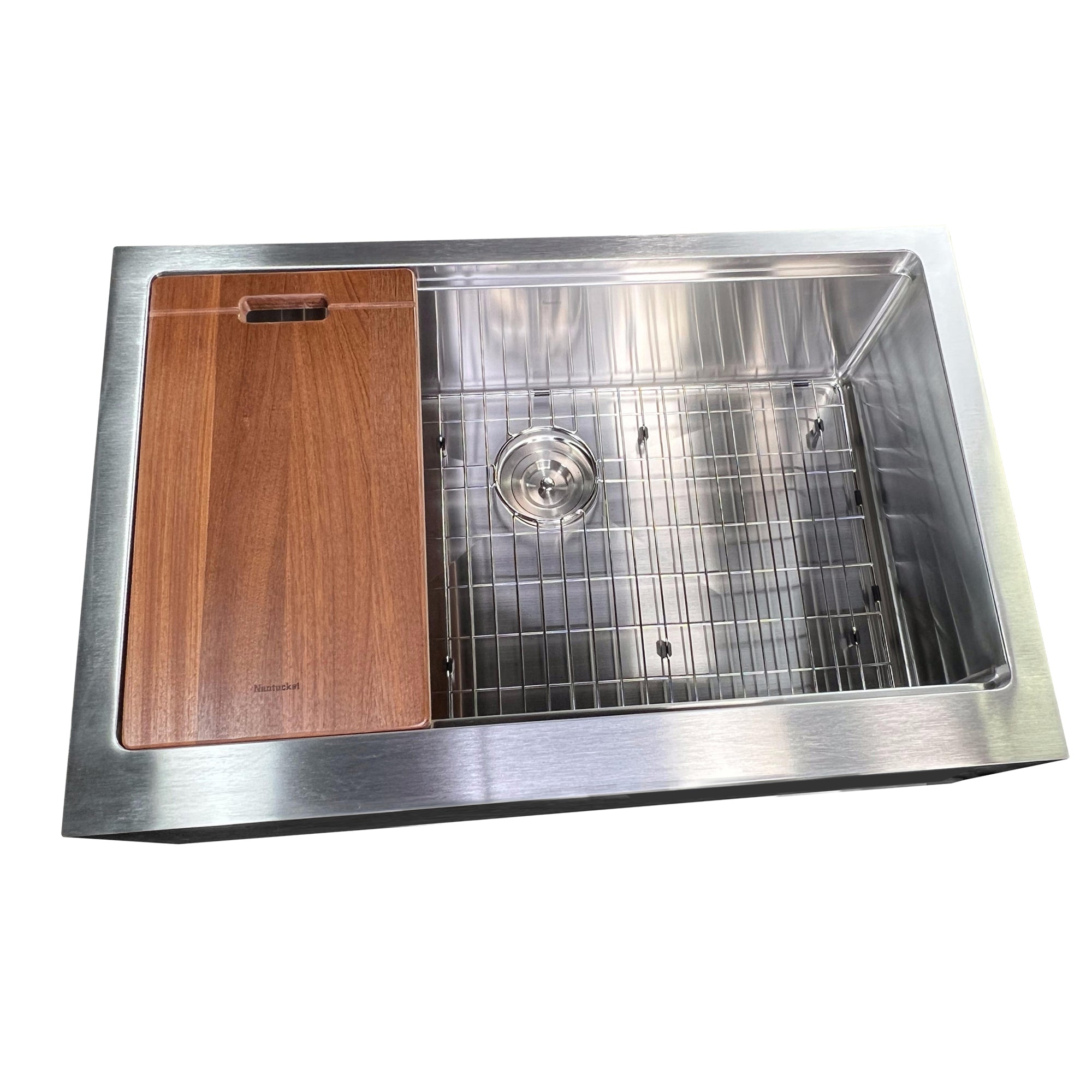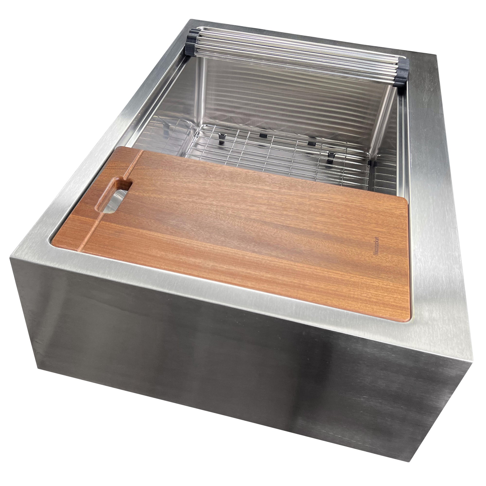 This undermount Pro Series Apron has a flat apron and an accessory ledge for an integral cutting board and roll up mat. Straight walls provide a modern industrial look in a farmhouse style sink. The bottom of the sink has channel grooves to divert water for proper drainage. Nantucket Sinks stainless steel sinks have thick rubber dampening pads to dampen sound. Our finishing process helps keep our stainless steel corrosion-resistant to rust and oxidation. The satin finish makes daily maintenance a simple rinse! Features a limited lifetime warranty. Cutting Board, Roll Up Mat, Bottom Grid and Colander Basket Drain is included with sink. Small Radius corners for easy cleaning.