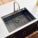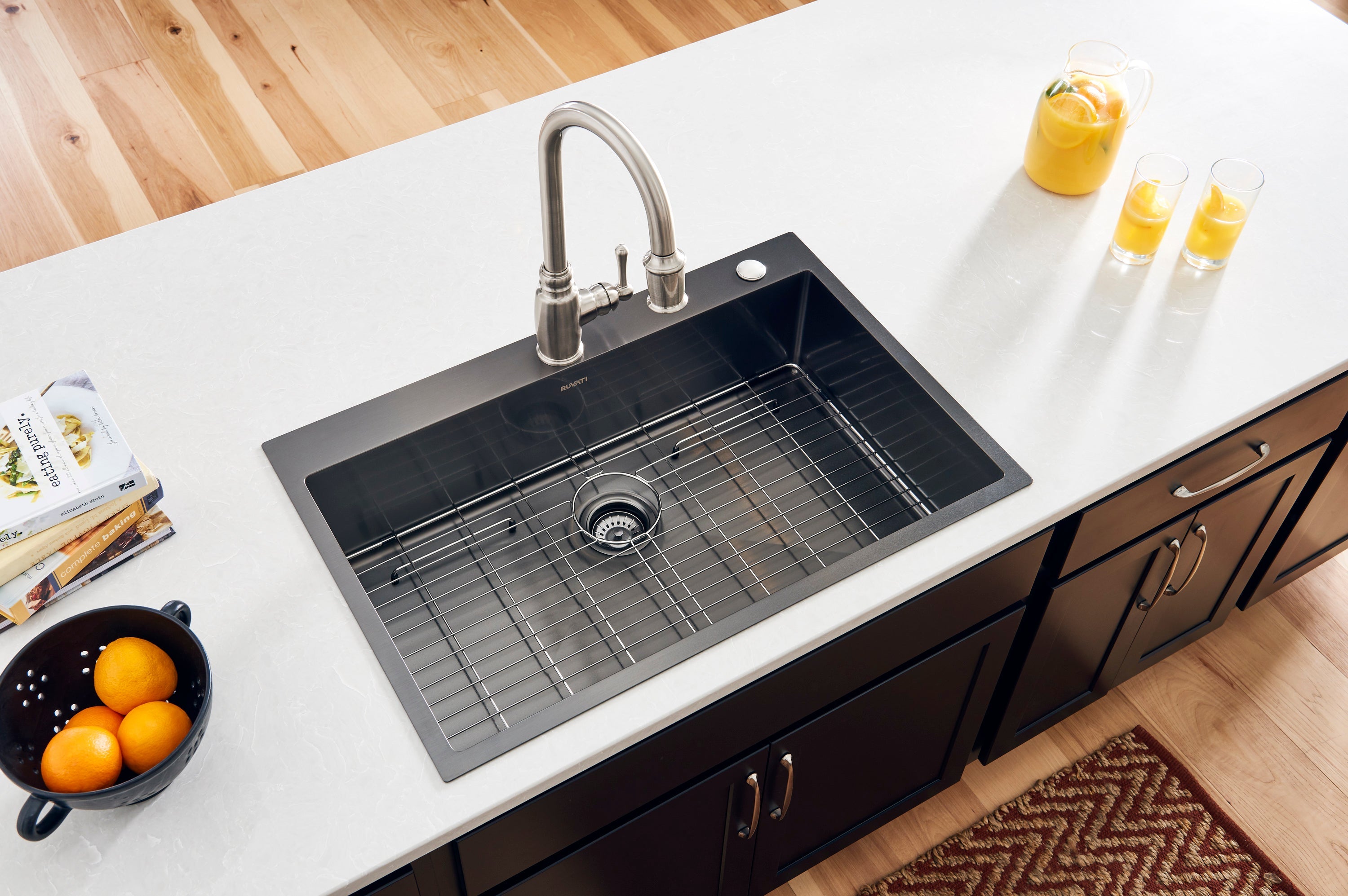 Ruvati brings color to the world of stainless steel with this new Gunmetal Black Stainless Steel sink. With an innovative nano-PVD finish, the stainless steel is overlaid with a colored finish that is resistant to wear and abrasion. The finish has a matte texture that is fingerprint and stain resistant. You can now match your sink color with your colored stainless steel appliances. The edgeX 10mm Tight Radius inside corners offer a slightly curved corner for easy cleaning while at the same time retaining the resolutely modern look. This sink comes in a standard 33-inch by 22-inch dimension, so it will retrofit in most existing cutouts from your old Topmount sink.