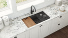 - INCLUDED IN BOX: Sink, solid wood cutting board, matching roll-up drying rack, matching color basket strainer drain assembly, stainless steel bottom rinse grid, installation guide.